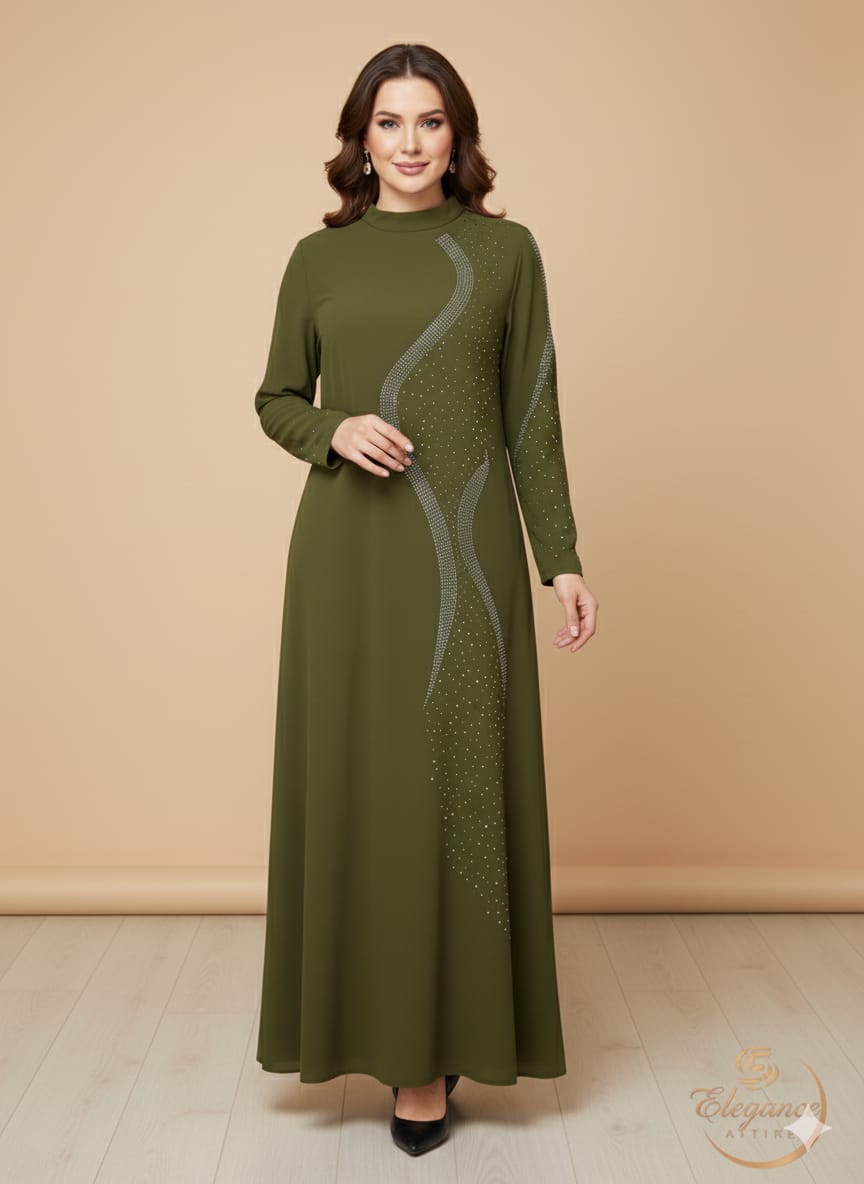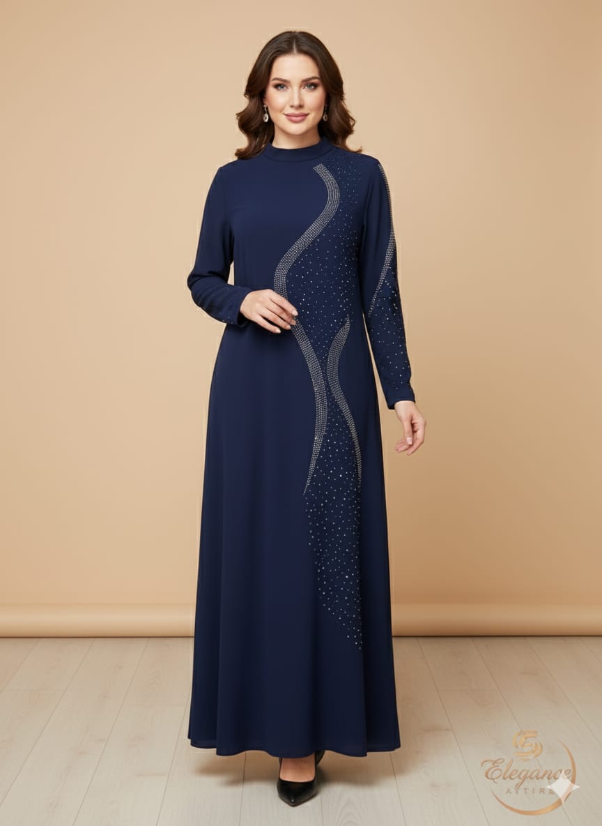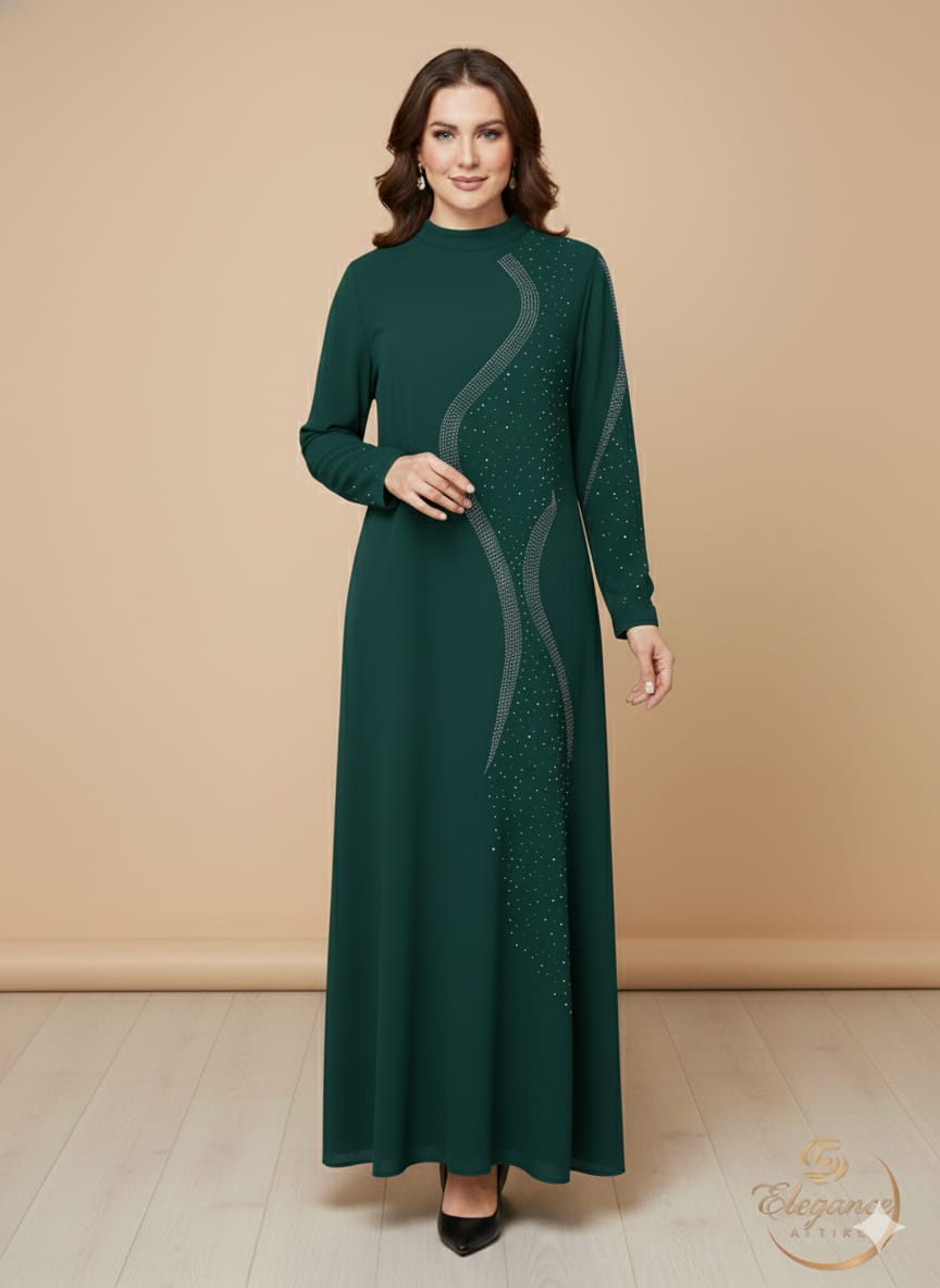 Discover the pinnacle of sophisticated design with this exquisite evening gown, proudly crafted in Turkey. The graceful, floor-length silhouette is designed to flatter, while the high neckline and long sleeves offer a touch of refined modesty. What truly sets this piece apart is the stunning cascade of shimmering embellishments that flows artfully down the bodice and along the sleeve, catching the light with every movement. A testament to superior Turkish craftsmanship, this dress is the perfect choice for weddings, formal galas, or any special occasion where you wish to make an unforgettable impression.
